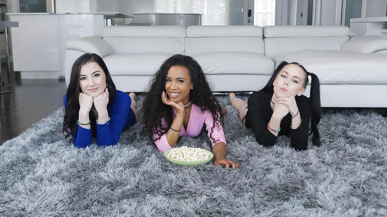 Demi Sutra, Megan Winters, and Bambi Black were super excited for their sleepover movie night. They all got matching pajamas and were ready to just relax and be girls! stepbrother tried to ruin things though. First he started to spy on the girls and act like a perv. They kicked him out, but that did not mean he was done yet. Just as the girls started watching their movie he walked in with his raging stiffy and had each of the girls take turns letting him fuck. The girls got a little extra creamy surprise for their popcorn, and it was non dairy!